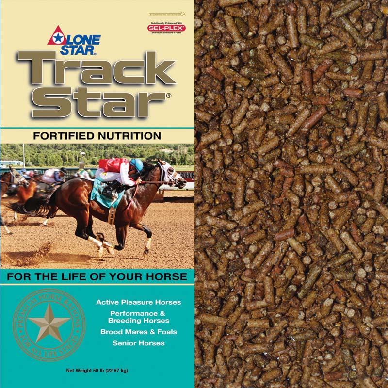 Good quality hay may be fed along with Track Star Senior. The amount of feed can be reduced by approximately 1 pound for every 2 pounds of hay.