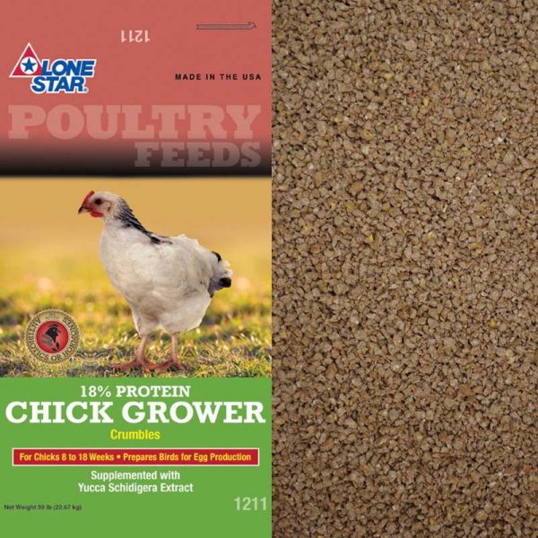 Feed free choice to growing chicks from 8 to 18 weeks of age. Keep feeders clean and provide a source of fresh, clean water at all times. At 18 weeks of age, begin feeding Lone Star 17% All Mash Pellets (code 1153).
