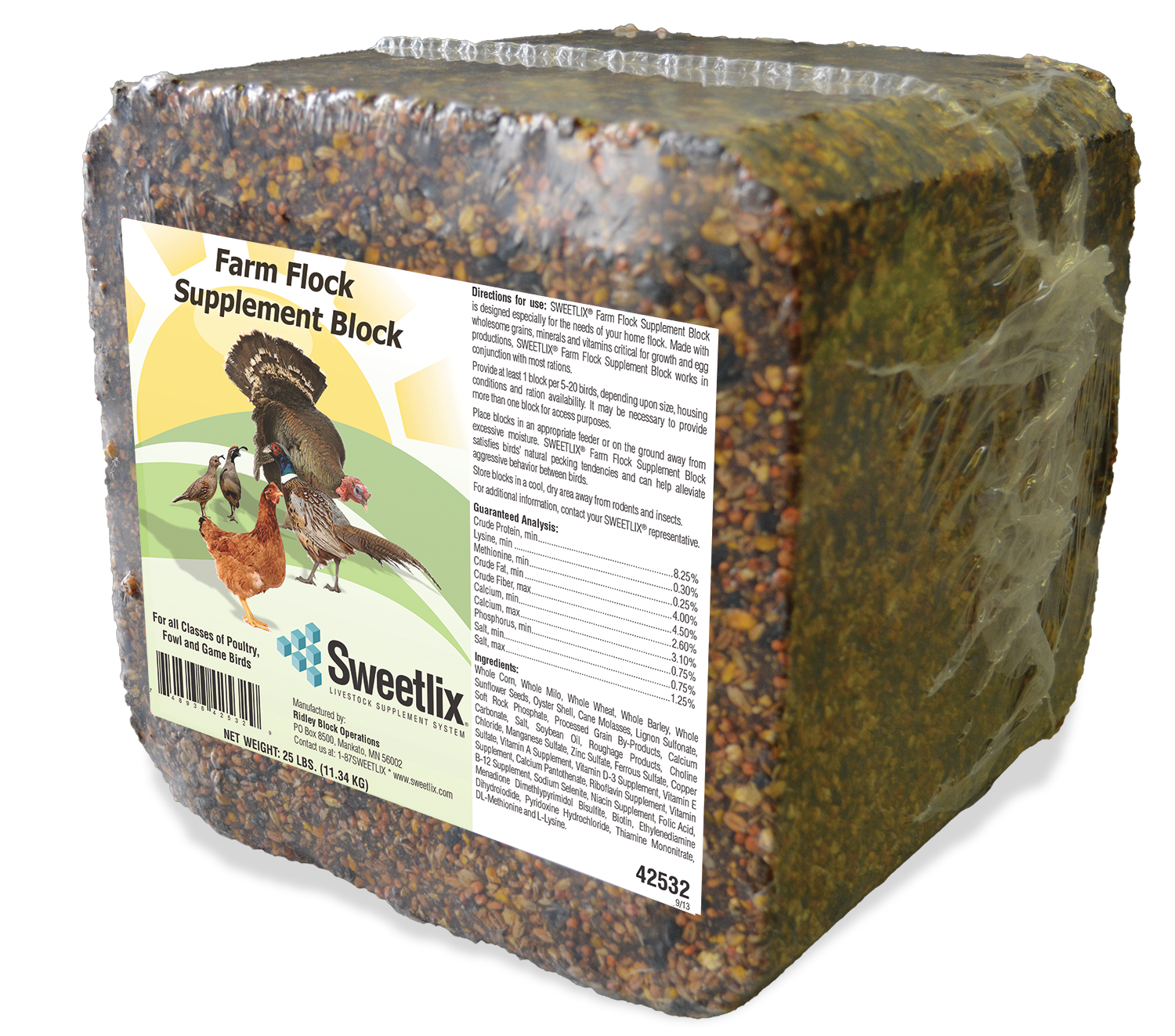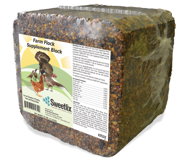SWEETLIX® Farm Flock Supplement Block is designed especially for the needs of your home fl ock. Made with wholesome grains, minerals and vitamins critical for growth and egg productions, SWEETLIX® Farm Flock Supplement Block works in conjunction with most rations.